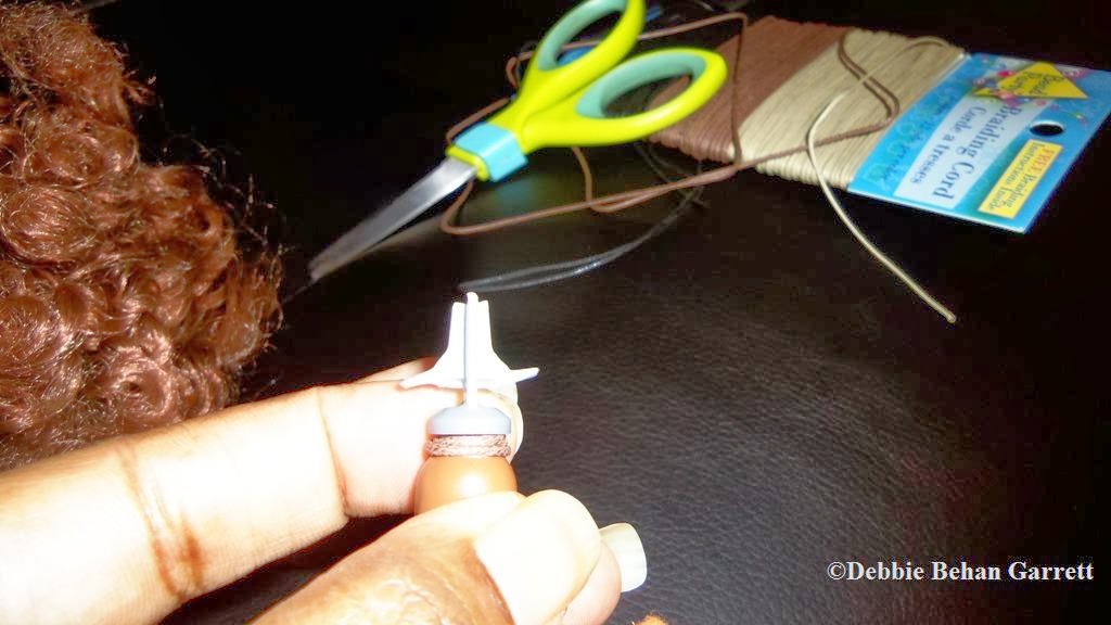 After examining the neck and locating the gap or area causing the head movement, I tried Muff's suggestion to wrap wire around the space between the neck and the prong. She suggested jewelry or garden wire, none of which I had; so I used braided cord instead. This was wrapped around the area several times. I tucked the cut end underneath the wrapped cord.