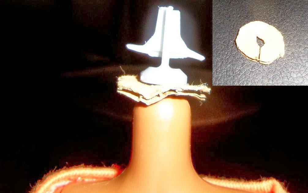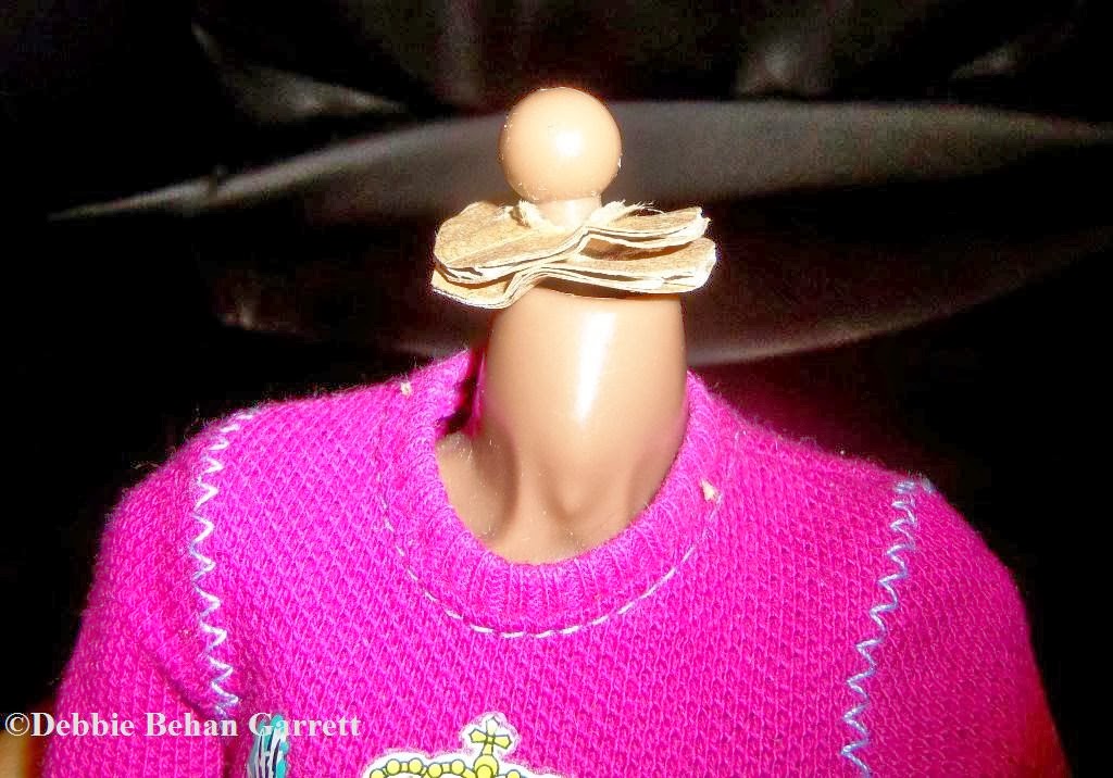 The above photo was taken before creating a cardboard disk to stabilize Ken's neck movement. The disk did prevent his head from rotating up to 180 degrees, but it created a gap on both sides of his head. Again, the cardboard disk was a little flimsy; so I reinforced it by using two disks, one on top of the other. See images below followed by what I did to eliminate the free movement.