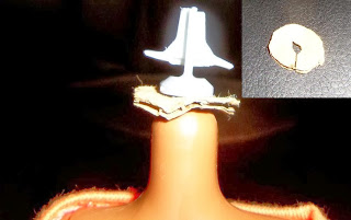 Bath Play Fun Ken was given an action figure body several months ago. The new body added several points of articulation and lots of pose-ability, but Ken's head would rotate even with the slightest movement. I decided to see if a cardboard disk would stabilize his head and neck.
