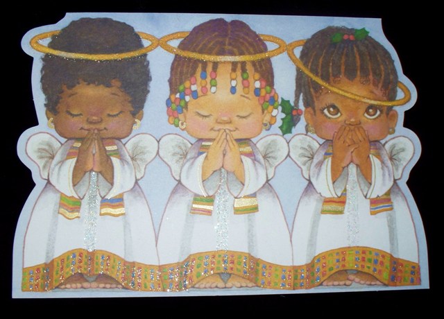 One of my favorite Mahogany holiday greeting cards features a trio of angels wearing Kente cloth-trimmed gowns. One angel has a crooked halo.