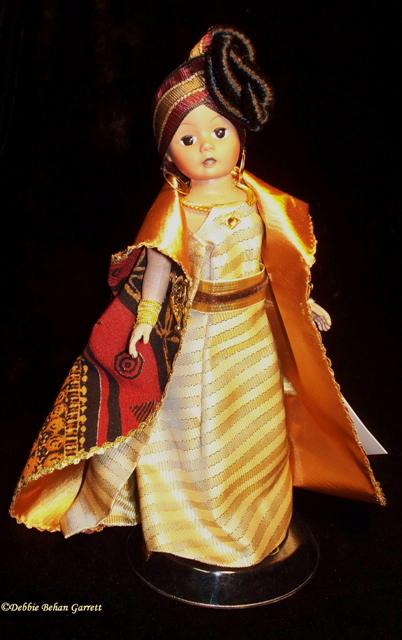 Nomsa Celebrates Kwanzaa by Madame Alexander looks quite elegant in gold lamé gown with earth tone coat and head wrap.