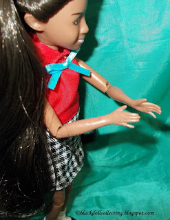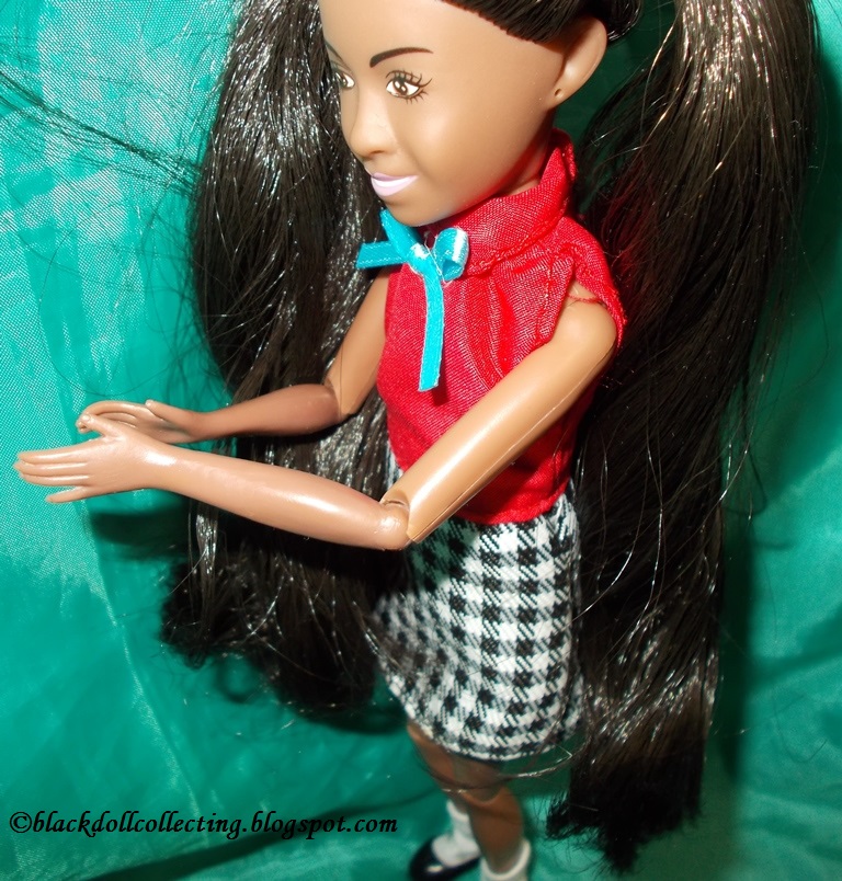 School Girl Keyshia (the boxed doll shown above) arrived in February 2014 with a few dark spots on her arms and hands, some of which were captured in this image taken shortly after she arrived. These were discovered after removing her black velour jacket, which I suspected then was the staining culprit.