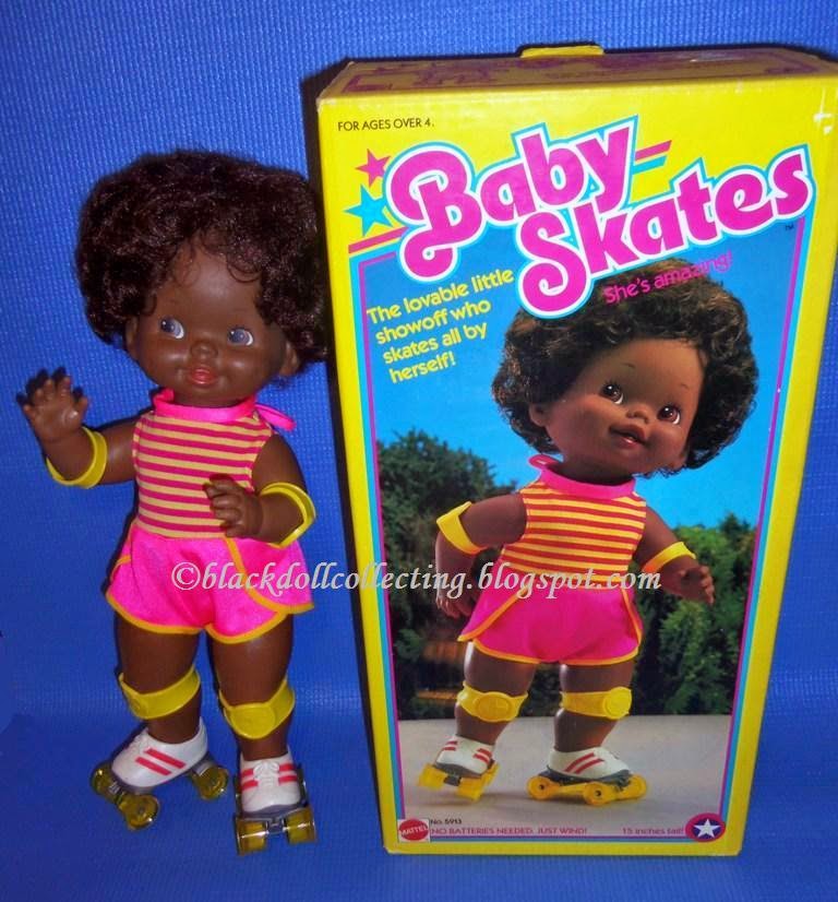 and yellow skater’s outfit, yellow elbow and knee pads, and roller skates. The copyright date for this skater that does not require batteries is 1982.