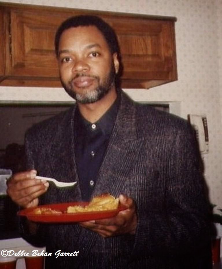 | With jacket on, Artsy poses with a some of my brother's artwork. |