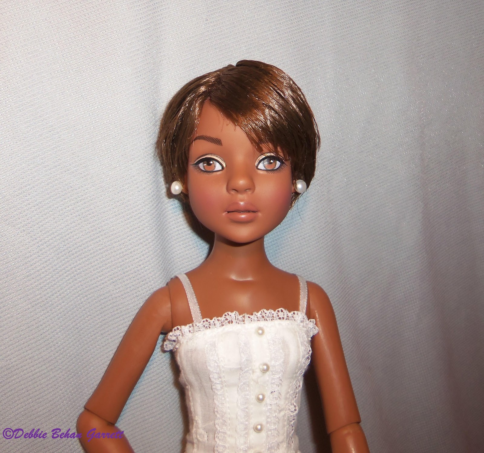 Lizette's ears were already pierced, but she did not come with earrings. Before noticing the pearl buttons on her white eyelet camisole, I thought pearls would enhance her appeal. She temporarily borrowed a pair of pearl earrings my children gave me for Mother's Day several years ago. These were later exchanged for blue studs.