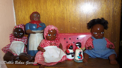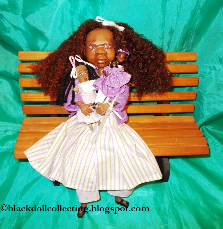 In December 2006, I interviewed Gloria Young, now Gloria Rone and published the interview in Black Doll-E-Zine's online group at Yahoo! Groups. Throughout the years, I have seen her work steadily progress. I remain fascinated by Gloria's doll creations that she initially categorized as primitive. When I think of primitive dolls, however, I think of distorted caricatures, which would not describe Gloria's dolls. Over nearly the past decade, I have purchased several (seen above) two within the last week (the two seated on the green backdrop on the left and right above). I gathered them all to share with the readers of this blog.