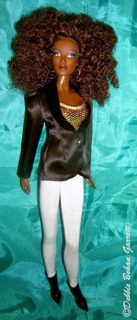 I dressed Nikki in the already-on-hand sequined gold tank top, black satin blazer, and gold booties from Barbie Basics accessory pack